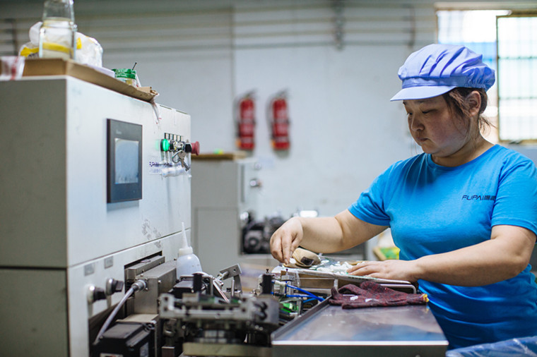福派電動(dòng)牙刷生產(chǎn)車間,一名工人正在裝刷毛