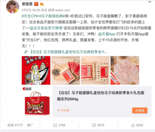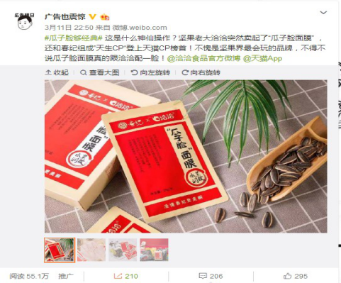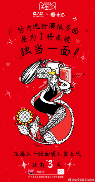 ??聯(lián)合泛90后的食材養(yǎng)膚品牌春紀組成天生愛美CP跨界推出“瓜子臉面膜”,“瓜子臉,夠經(jīng)典”的口號,更是戳到年輕人輕松變美的心聲。洽洽更是貼心推出洽洽x天貓3.8女王節(jié)限定款“零食+面膜”的大禮盒,誓必要把“女王們”寵壞的節(jié)奏。