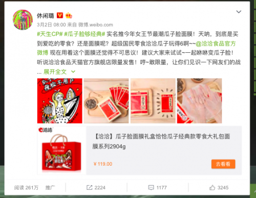 ??最后,我們通過各個垂直平臺、權威大V發(fā)聲,深化跨界影響,全面提升品牌口碑,洽洽瓜子面膜得到各界贊譽!