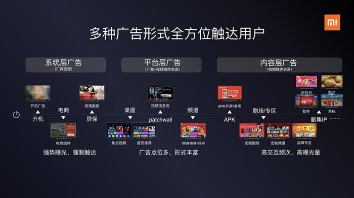 小米OTT作為唯一打通系統層、平臺層、內容層的廣告平臺,從開機廣告、高清畫報等強曝光形式;到平臺層桌面、PatchWall、頻道的寬廣渠道;再到內容層強勢IP、定制劇場、定制頻道的高交互資源,在媒介深度上挖掘觸點,可以幫助品牌與用戶持續溝通。值得一提的是,小米OTT還在媒介形式、媒介組合上進行了一系列的創新,從而使得營銷效果更加明顯,更能提升廣告主品牌的新品牌、新產品認知度。