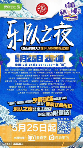 在第一期節目播出當晚,《樂隊的夏天》特別聯動全國27家Live House舉辦線下狂歡趴,參演樂隊空降現場與樂迷互動。通過直入潛在用戶所在的高粘性垂直場景,讓用戶體驗深度參與感,打開線下營銷場景,開辟更多全新玩法與機會。