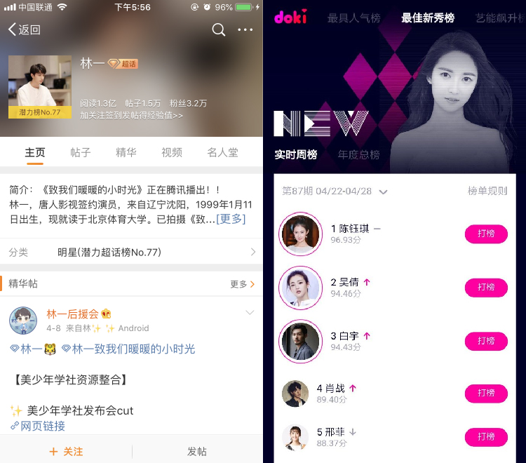 林一超話入選潛力超話榜第77,邢菲登上第87期doki最佳新秀榜前5