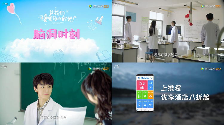 攜程&《小時光》片尾“腦洞時刻”:在劇目片尾,為攜程量身定制“腦洞時刻”,以創(chuàng)意混剪的創(chuàng)意形式結(jié)合男主劇中的學(xué)霸人設(shè),模擬“實驗室內(nèi)算公式,算出攜程黃金會員最劃算”的劇情,用有趣的創(chuàng)意表達出品牌訴求,上線后收獲了用戶廣泛好評:“顧未易科學(xué)怪人好厲害”、“攜程這個廣告笑死我了”、“狗糧已接受,希望旅途中可以遇到甜甜的戀愛”、“期待更多的甜甜旅行腦洞”……