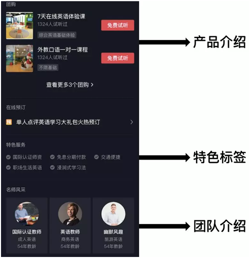 3. 團隊介紹。對于健身、教育、攝影等強調(diào)一對一或一對多的服務(wù)的行業(yè)來說,一位“名師”有著比常人更強大的說服力。團隊介紹功能允許企業(yè)藍V與知名教師、設(shè)計師、專屬教練等優(yōu)秀企業(yè)員工進行帳號綁定,展示品牌實力的同時讓用戶更了解團隊成員信息,增強用戶對服務(wù)的信心,可謂是商家自己的“代言人”。