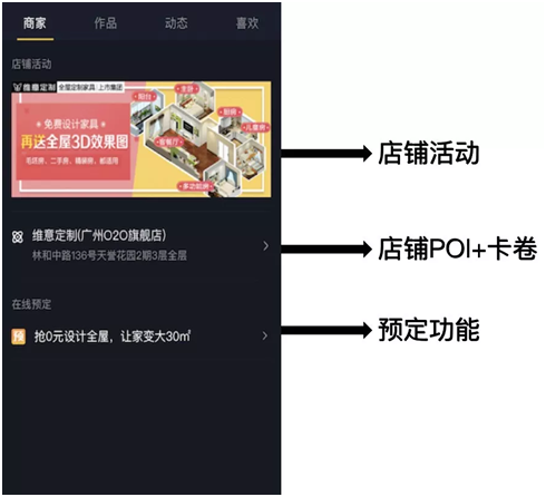 2.店鋪POI+卡券。除了預(yù)定,商家頁面支持多樣的營銷信息推廣,POI正是其中的關(guān)鍵功能之一。在商家認(rèn)領(lǐng)POI地址后可以關(guān)聯(lián)線下店鋪,用戶觀看帶有POI標(biāo)簽的短視頻時,可通過點擊POI標(biāo)簽的方式直接跳轉(zhuǎn)到商家企業(yè)號主頁,快速引流。