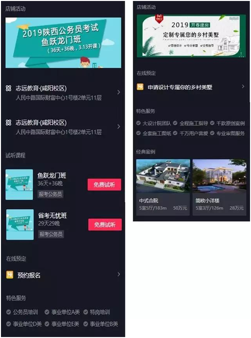 為了更好的適配垂類行業(yè)的特定需求,商家頁面提供了5個垂直行業(yè)定制化模版,例如專為教育機構(gòu)打造的“試聽課程”模塊,用戶可以直接免費試聽;專為家裝設(shè)計行業(yè)定制的“經(jīng)典案例”模塊,以詳實而精彩的案例解析,打動用戶。