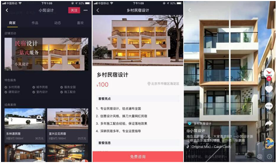 小筑設(shè)計是一家定位民宿的設(shè)計機構(gòu),業(yè)務(wù)覆蓋建設(shè)設(shè)計、建筑改造、室內(nèi)設(shè)計、庭院設(shè)計等。在2018年10月成為抖音企業(yè)認(rèn)證賬號之后,小筑設(shè)計由專人負(fù)責(zé)企業(yè)藍V運營,保持高頻日更,在抖音上展示各類不同的民宿案例、民宿設(shè)計等相關(guān)知識,吸引那些喜愛創(chuàng)意民宿設(shè)計的用戶。