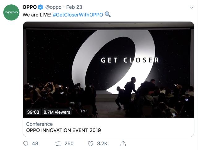 OPPO就在今年的MWC上進行了一次非常成功的社交直播互動。在MWC2019開幕前夕,OPPO舉辦了2019 OPPO創新大會,正式對外展示其"10倍混合光學變焦"技術及首部5G手機,并在Twitter上同步發起了主題為"#GetCloserWithOPPO(#與OPPO更近)"的推廣活動。