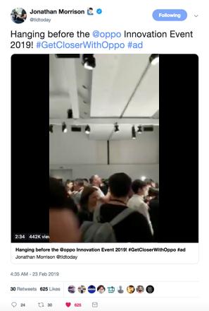 在今年MWC期間,針對來自美國、歐洲、中東和歐洲的目標消費者,OPPO與科技達人Jonathan Morrison(@tldtoday)合作,在Twitter上進行了OPPO新品的現場直播展示和定制內容拍攝,收到了良好的效果,超過44萬Twitter用戶觀看了直播。