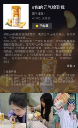 最近,伴隨蒙牛純甄黃桃燕麥酸奶新品上市的重大節點,蒙牛純甄借勢抖音平臺發起“品牌伙伴選拔大賽”活動,以#你的元氣撩到我#作為演繹主題,形成品牌圈層信任,催生UGC優秀作品創作。通過短視頻話題的持續發酵,實現病毒式營銷效果。