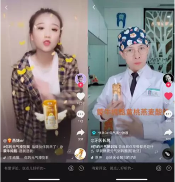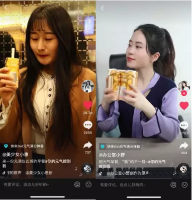 在KOL的選擇上,也優先選擇具有明顯身份特質的頭部KOL,例如:辦公室小野、牙醫長晟,主打辦公室白領人群,KOL花式演繹喪氣的早晨來一口純甄黃桃燕麥酸奶,立刻元氣滿滿,深度詮釋純甄黃桃燕麥的早餐能量,再配合優質網紅達人結合抖音神曲和創新貼紙進行演繹,激發普通用戶創作欲望,引發大家重新拾起認“甄”吃早餐的觀念。