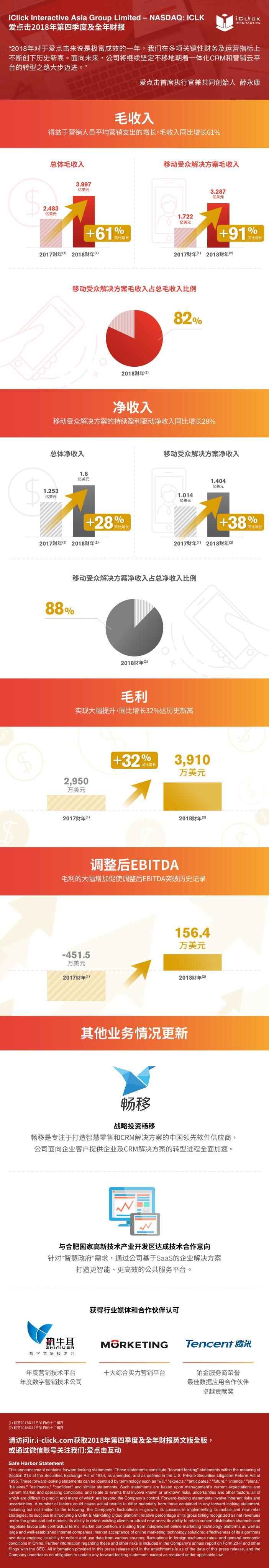 2019年3月25日,北京—— 中國(guó)領(lǐng)先的獨(dú)立在線營(yíng)銷數(shù)據(jù)與技術(shù)平臺(tái)愛點(diǎn)擊iClick(NASDAQ:ICLK)近日發(fā)布了截至2018年12月31日未經(jīng)審計(jì)的第四季度及全年財(cái)務(wù)業(yè)績(jī)。財(cái)報(bào)顯示,2018年愛點(diǎn)擊全年毛收入為3.997億美元,同比增長(zhǎng)61%;全年凈收入為1.6億美元,同比增長(zhǎng)28%;毛利增幅32%達(dá)到3,910萬美元。