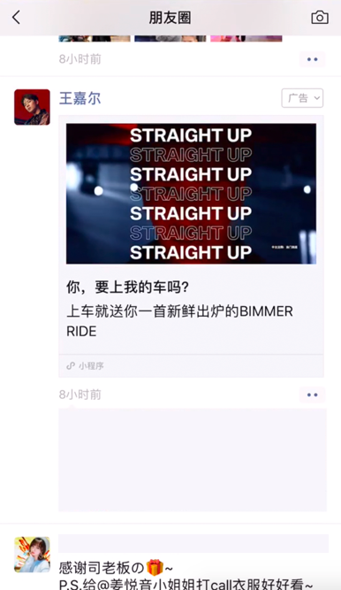 而“明星送祝福”的朋友圈廣告新方式,同樣讓用戶全情參與到廣告互動中去。當(dāng)紅流量小生王嘉爾以寶馬車主的身份出現(xiàn)在朋友圈,邀請用戶“上車”,用戶通過點擊并滑動頁面,即可進(jìn)行試駕預(yù)約,完成預(yù)約后更可有機(jī)會與明星見面或獲得親筆簽名紀(jì)念品。借力王嘉爾的明星效應(yīng),寶馬成功吸引大量粉絲通過朋友圈廣告進(jìn)行試駕預(yù)約、收獲大量潛在用戶。