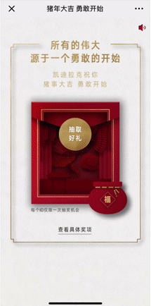 凱迪拉克的朋友圈廣告則通過“圈出LOGO” 增加與用戶的互動和興趣性,用戶圈出品牌LOGO后即可開啟品牌彩蛋頁面,并領(lǐng)取福袋紅包。此外,品牌更根據(jù)傳統(tǒng)年俗,從大年初一到初六為用戶定制不重樣的“假期生活黃歷”,深度植入汽車在春節(jié)每一天的使用場景。別開生面的廣告形式收獲了極好的用戶互動效果,成功為品牌收獲消費者好感。
