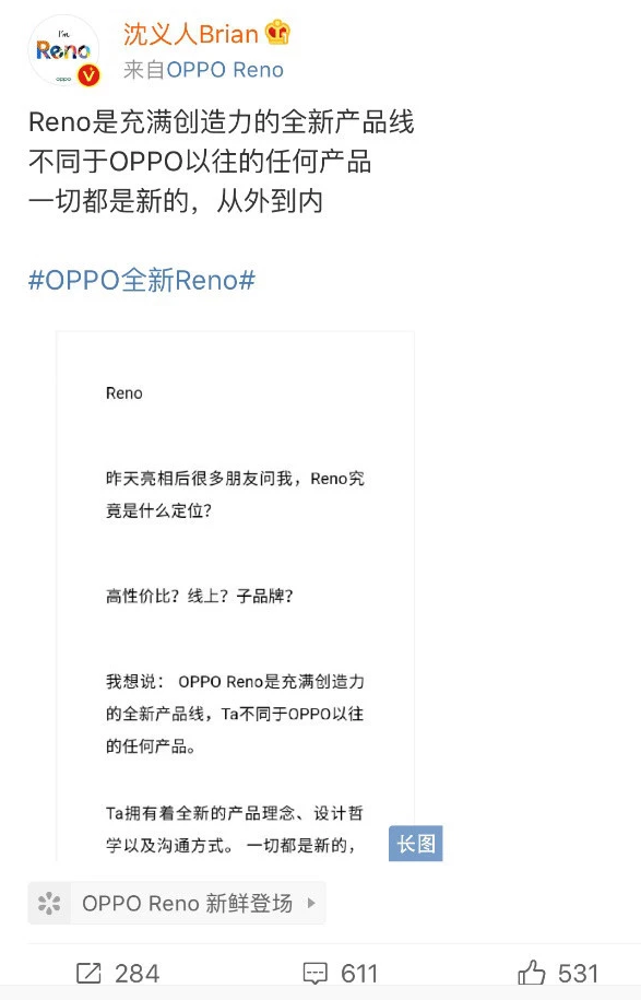 “在我看來,Reno為什么一定要有一個(gè)含義?Reno是我們創(chuàng)造出來的,因?yàn)榍八从校詻]有標(biāo)準(zhǔn)答案。”經(jīng)過11日一天的微博熱議,沈義人在今天發(fā)布的微博長(zhǎng)文中,又進(jìn)一步透露了Reno的一些細(xì)節(jié)。