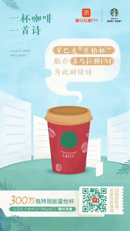 舉個(gè)簡(jiǎn)單例子,比起刷手機(jī),你很難漏掉音頻節(jié)目中廣告,特別當(dāng)不是會(huì)員的時(shí)候,這是余建軍口中的“獨(dú)占性”。多項(xiàng)實(shí)驗(yàn)也表明,同等條件下,人類對(duì)于聽覺記憶往往優(yōu)視覺記憶。據(jù)艾媒數(shù)據(jù)顯示,喜馬拉雅平臺(tái)的用戶還普遍具有“三高”特征(即高學(xué)歷、高收入、高活躍)。去年8月,喜馬拉雅首次與星巴克跨界推出了300萬杯“為此刻讀詩”的限量版星怡杯,正是一次用戶人群匹配的營銷合作,讓音頻廣告不再是打擾而是打動(dòng)。