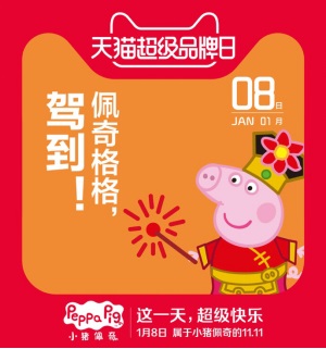 2019年1月8日,《小豬佩奇》牽手天貓超級品牌日再度亮相,讓更多的中國觀眾了解到,可以放心的在官方渠道購買自己喜愛的《小豬佩奇》IP周邊產品,同時天貓超級品牌日當天還放出了諸多優惠福利。