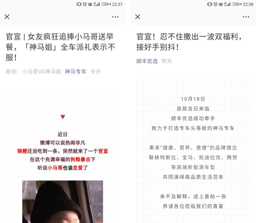 僅有線下一波“零食鋪”是不夠的,神馬專車還通過巧用“全媒體矩陣營銷法”傳播新思路,打響官微主陣地,借助大火的“官宣體”文案快速引發(fā)關注。
