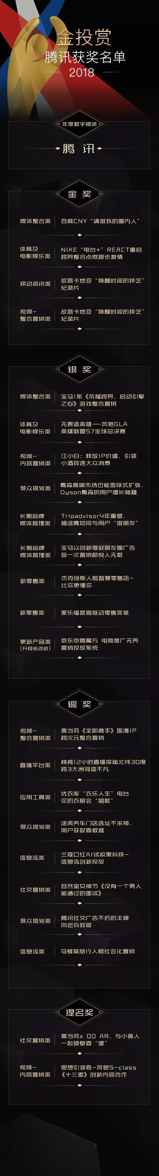 10月15日-18日,第十一屆金投賞國際創(chuàng)意節(jié)在上海舉行。憑借行業(yè)領(lǐng)先的營銷能力,騰訊助力品牌有效觸達消費者,實現(xiàn)售賣增長的同時,亦憑借創(chuàng)新營銷策略榮獲年度數(shù)字媒體平臺。