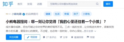 品牌月活動剛開始,小熊電器便在知乎上,推出問題“哪一刻讓你覺得[我的心里還住著一個小孩]”。先后吸引了近44萬人次瀏覽,收獲上千關(guān)注量及回答量。網(wǎng)友積極參與話題,分享自己的日常以及想法——“可能是看到這類漫畫還會大笑出聲的時候(并且為了關(guān)注這位漫畫家 看到最新作品 專門申請了個推特賬號)”;“吃小時候的零食的時候。不想上班的時候。想法天真被人取笑的時候。固執(zhí)的時候。。。。這里一直住著小孩,只是不得不成熟了。”等答案更引起了共鳴,獲得網(wǎng)友點贊。