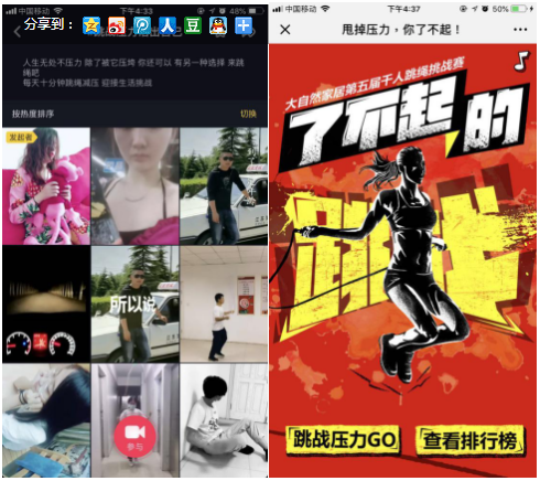 以紀(jì)錄片人物故事為核心,大自然家居層層遞進(jìn),借以時下年輕人愛看想看的熱門創(chuàng)意形式——長圖文,將減壓精神二次創(chuàng)新,繼續(xù)在雙微發(fā)酵跳繩公益精神。此外,大自然家居更敏感地嗅到短視頻平臺的影響力,在抖音平臺發(fā)起“跳戰(zhàn)壓力,活出自己”跳繩公益比賽,網(wǎng)友們紛紛響應(yīng),拍攝上傳自己跳繩減壓的段子,引發(fā)了不起的跳戰(zhàn)熱潮。至此,大自然家居”了不起的跳戰(zhàn)”形成“雙微一抖”的傳播陣營,矩陣分布優(yōu)勢互補(bǔ),最大限度將活動影響力擴(kuò)大化。為了呼吁大家積極應(yīng)對壓力,大自然家居設(shè)計開發(fā)H5互動游戲,將跳繩公益比賽推向全國。