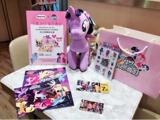 現場哈根達斯門店低門檻消費滿69元即可獲得小馬寶莉大禮包,禮包內含現場可立即使用的哈根達斯50元抵用券、還有移步樓上就能直接使用的玩具反斗城30元代金券。除此之外, 還有可愛到犯規的基礎小馬套裝、精美的小馬寶莉紋身貼紙和情景貼紙。另外,此次活動小馬寶莉還聯合哈根達斯,在上海全市近70家哈根達斯門店為消費顧客送出小馬寶莉限量大禮包,讓更多的粉絲與消費者感受到小馬寶莉的友誼魔力與正能量。