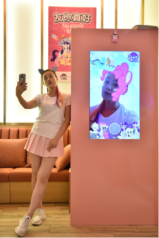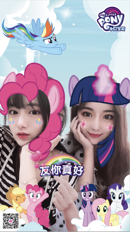 現場有小馬寶莉與全球最懂美的美圖公司聯手打造的小馬寶莉主題美圖萌拍魔鏡,粉絲只要進入“魔鏡”范圍即可在魔鏡中看到自己與小馬寶莉元素的萌拍合照,并可實現一鍵拍照保存。活動期間粉絲還可以通過美圖秀秀APP的萌拍專區選取同款小馬寶莉主題貼紙,與身邊親密“萌友”合照體驗。
