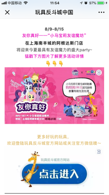 另外,與玩具反斗城的品牌“友誼”,在本次“小馬寶莉友誼魔坊”的合作中得到進一步深化,小馬寶莉通過游戲互動與禮品贈送的方式,包括官方自媒體聯名互推、憑玩具反斗城消費小票進店免費體驗、玩具反斗城消費滿259元免費進店領取小馬寶莉禮包等,不但增強了顧客對玩具反斗城的了解與認知,同時也吸引消費者走進玩具反斗城,促成更多實體銷售,而玩具反斗城對小馬寶莉此次活動也提供了充份支持,品牌和品牌,IP與合作商新優合作方式出現,將有可能成為品牌與零售商合作的新典范。