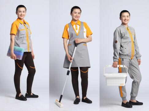 保潔人員是后期與用戶打交道最多的員工,自如保潔的工裝設計有所不同的是,在簡約基礎上加高了腰線,兼顧美感和實用性。