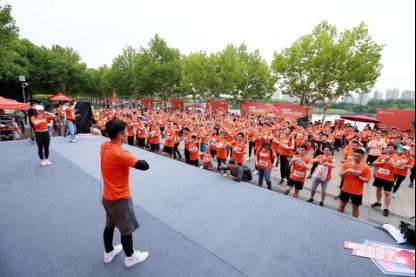 6月23日,上海陰雨,不過這絲毫不影響現場跑者的激情,開跑前由專業的健身教練帶領大家做跑前熱身,跑前來一節甩手甩腳甩掉疼痛的健身操,帶你放松肌肉,燃動全身。活動現場,500多同樣穿著T恤的米粉薈聚成一片橙色的海洋,大家熱情高漲。