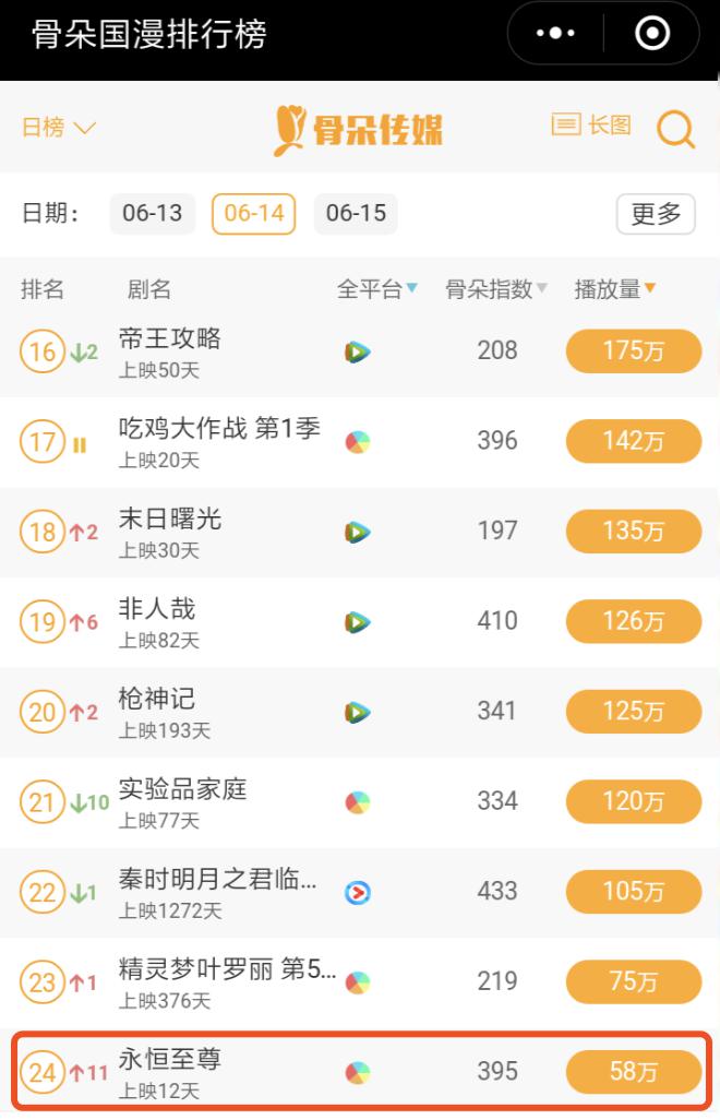 在6月14日的骨朵國漫排行版中,《永恒至尊》位列24位,是TOP50中唯二進榜的動態漫畫(另一入榜的動態漫畫同為網易漫畫出品的《我在皇宮當巨巨》)。