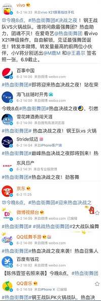 決戰之夜,為節目助力的不僅來自各大舞團,更有十一家品牌對《熱血街舞團》的聯名應援。而引得如此規模的助推,除了節目本身的影響力之外,還與愛奇藝多年來在娛樂營銷上的努力以及與客戶達成的默契脫離不開。