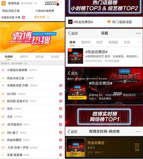 節目第十二期上線后播放量迅速突破17億,與此同時,#熱血決戰之夜#、#火鍋戰隊暗黑舞#、#宋茜陳偉霆 齊舞#等話題也迅速登上微博熱搜,#熱血街舞團#更是分別占領熱門話題榜小時榜TOP3和綜藝榜TOP2的位置。