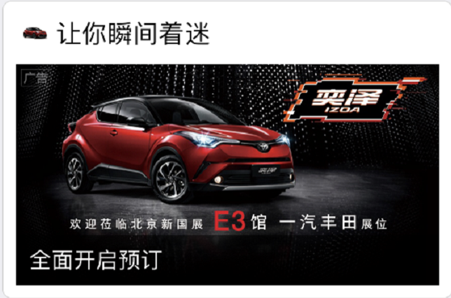 在找到合適的溝通手段之后,活動環節設計也是營銷的關鍵一步。用戶只要點擊品牌廣告,就可了解一汽豐田奕澤IZOA的詳細信息。