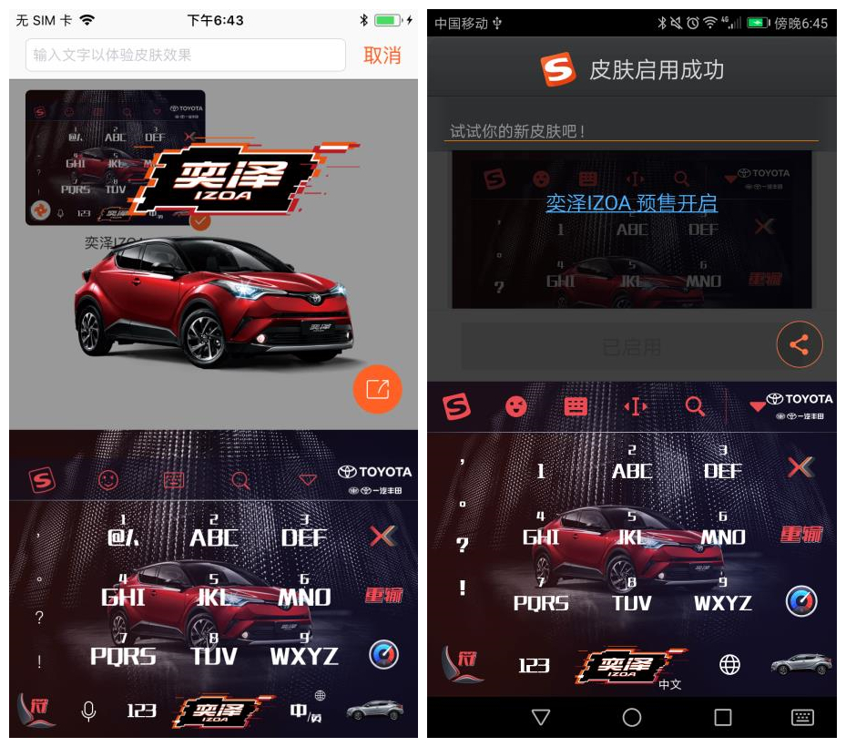 此外,作為最受年輕人歡迎的輸入法,搜狗還為一汽豐田奕澤IZOA打造了專屬的輸入法皮膚和專有表情,與一汽豐田奕澤IZOA“時尚”、“酷炫”的特質進行呼應,受到年輕人追捧。