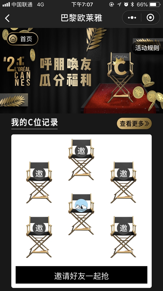 為了進一步提升小程序的“運營深度”,巴黎歐萊雅特意推出了“簽到贏大獎”和“搶C位得紅包”活動,一改過去人們對于小程序“用完即走”的固有印象,通過“點擊簽到得優惠”這樣一個簡單的方式提升小程序粘性;而“搶C位”更是將微信的社交裂變能力發揮的淋漓盡致,邀請好友共同分享品牌福利,以“強驅動”的方法帶來品牌關注度和用戶量的快速爆發。