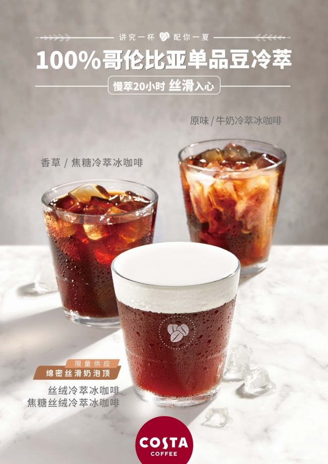 繼去年為消費者帶來了廣受好評的冷萃咖啡,今年COSTA為追求均衡口感和冷萃制作工藝的咖啡愛好者們帶來了更為精致且口味豐富的冷萃系列——除經典原味冷萃冰咖啡外,還有香草/焦糖冷萃冰咖啡、牛奶冷萃冰咖啡和僅在限量門店供應的絲絨/焦糖絲絨冷萃冰咖啡,以滿足不同咖啡愛好者的口味偏好,相信總有一款可以取悅你挑剔的味蕾。