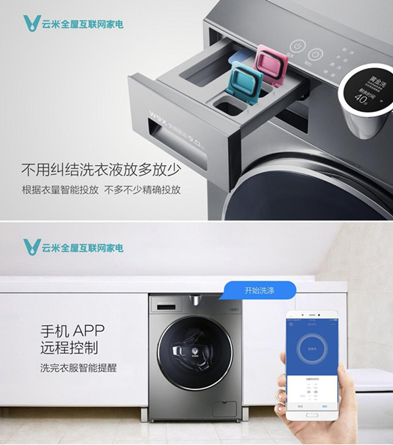 云米互聯網洗衣機,40℃黃金洗,通過人工智能衣物識別程序自動判斷衣物重量,自動精準投放洗衣液,根據水質智能調節洗滌程序,全程顯示洗滌剩余時間,洗滌完成之后還伴有終端提醒。