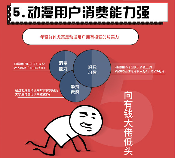 報告顯示,動漫用戶整體的平均可支配零花錢在780元/月,其中花在娛樂消費上(包含娛樂線下活動、游戲、動漫等充值)的錢高達204元/月,說明二次元用戶擁有極強的購買力且在娛樂方面的消費占比較高。