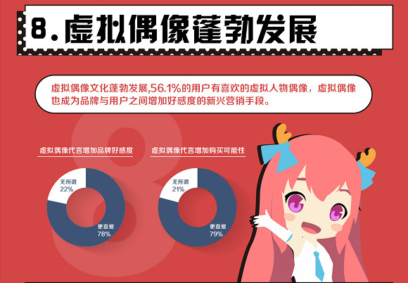 除此之外,二次元用戶大多有追捧的虛擬偶像,而且近80%的二次元用戶表示,如果他們喜歡的虛擬偶像代言了某個品牌,將會大大增加他們對品牌的喜愛度和購買意愿。在品牌年輕化轉型迫在眉睫的前提下,如何通過營銷拿下二次元用戶成為眾矢之的。