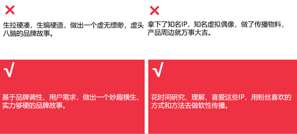 三次元的品牌如何才能玩轉二次元營銷?網易漫畫市場總監羅茜丹和網易Lofter市場總監唐娟認為必須做好3點:第一,必須要找到合適的故事。如果品牌本身故事性強,那就量身定做專屬IP故事;如果品牌本身故事性弱,那就找到一個和自己品牌調性匹配的IP故事合作;第二,必須要找到合適的嫁接點,不管是內容植入,人物代言,還是聯合知名動漫IP開發周邊,都需要找到合適的嫁接點;第三,把硬的做軟,把軟的做硬。所謂把硬的做軟,指得是在傳播上要軟,即使品牌和知名動漫IP達成了合作,也要耐心去研究這些IP,研究他們的粉絲,用粉絲喜歡的方式方法去做傳播;所謂把軟的做硬,指得是品牌故事必須言之有物,不能太過虛無縹緲,塑造的IP故事實力要足夠硬,這樣才不會流于形式,浮于表面。
