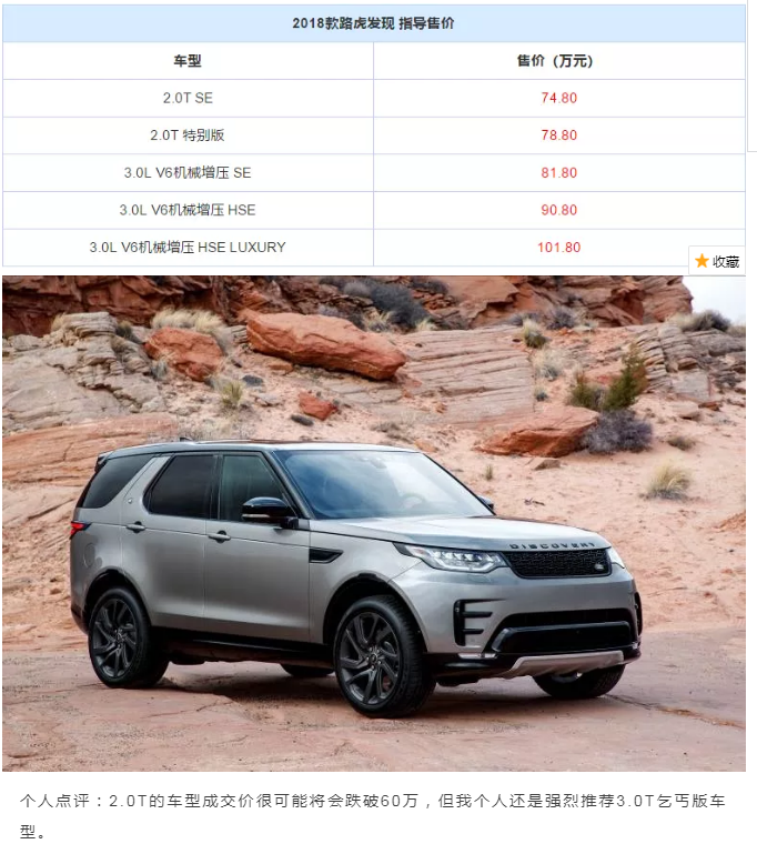 2018款路虎發(fā)現(xiàn)正式上市,新車推出搭載2.0T Ingenium四缸發(fā)動機和3.0L V6機械增壓發(fā)動機共計5款車型,其售價區(qū)間為74.80-101.80萬元。此次2018款路虎發(fā)現(xiàn)的推出主要是增加了兩款2.0T車型以及針對3.0L V6車型在配置方面的調(diào)整,從而更好的提升該車整體競爭力以及消費者的關(guān)注。詳細售價請看下表: