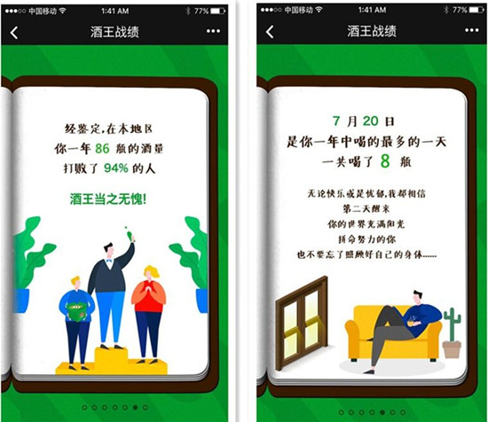 啤酒這一快消品相對較大的細分市場,飲酒者對于數量的感知與比拼,無意是來自產品自身外最大的感官刺激。當消費者打開這一份千人千面的基于自己喝酒行為的H5推送的時候,青島啤酒就像一個朋友一樣默默的記錄著他們,告訴每一位消費者個體,這一年中他們與青島啤酒之間的故事。也許是驚訝,我那天能喝這么多?也許是好奇,我看看你喝了多少?潛移默化中,內化于心外化與行,拉近了品牌與消費者的距離。消費者營銷不僅僅是利的誘惑,情與利的結合更是對一個品牌忠誠度最好的幫助。