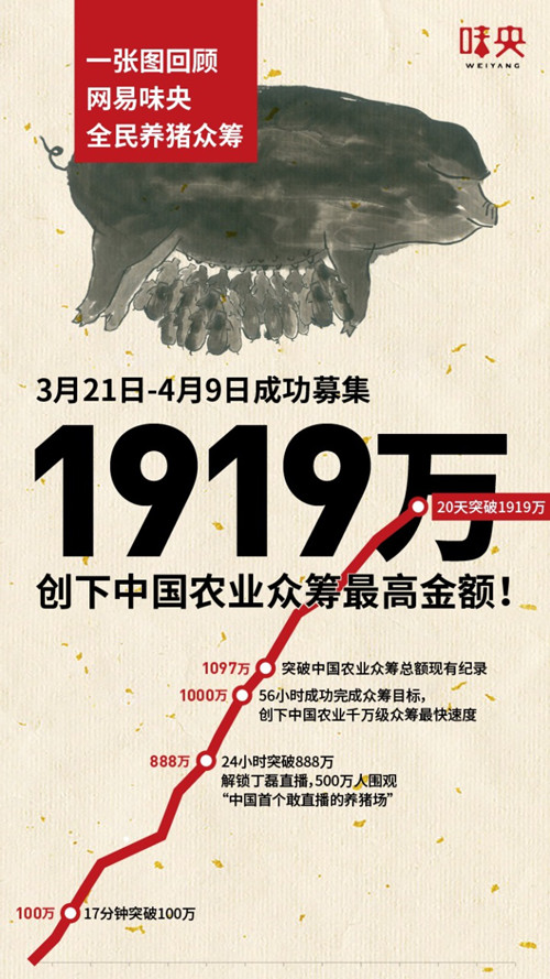 在2017年3月,網(wǎng)易味央又出奇招,發(fā)起1元“全民養(yǎng)豬眾籌”的整合營銷,以低門檻、趣味化、多元的方式,成功將“網(wǎng)易養(yǎng)豬”變成是“大家養(yǎng)豬”,讓吃瓜群眾正式從“消費者”變成“參與者”。同時,用“眾籌”這一天生自帶“情感”的方式闡述七年的故事努力刷用戶好感度。此次眾籌最終募集金額1919萬,刷新中國農(nóng)業(yè)眾籌第一記錄,也讓一度低迷的眾籌行業(yè),看到了品牌農(nóng)業(yè)的另一種可能。