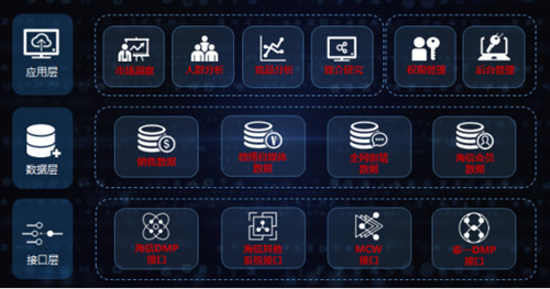 應用層包含市場洞察、人群分析、競品分析、媒介研究等統一架構。為這一層面提供支撐的,也是展現大數據營銷服務商能力的則是數據層和接口層。