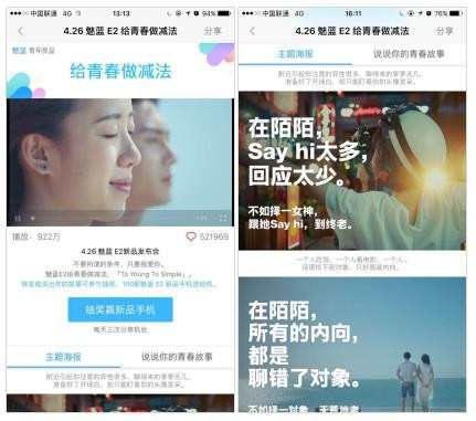 ??魅族自陌陌商業化起,便于此深耕細作。魅藍以“Quality For Young”青年良品為品牌內核,主攻年輕人市場,一直為用戶群傳播更年輕、更貼近青年文化、更注重有設計感的生活方式。魅藍選擇與目標受眾群體和品牌調性高度吻合的陌陌為主陣地,進行深度捆綁合作。雙方通過“給青春做減法”話題引爆,為發布會直播預熱;邀請張碧晨出席發布會為品牌背書,在陌陌進行現場直播;發布會結束后,利用陌陌平臺數據基礎,對目標受眾進行精準覆蓋,為官網導流,提升銷量轉化,成功完成了一次“社交+視頻+場景”的差異化情感營銷。營造魅藍賣的不止是手機,更是一種年輕人的生活方式。