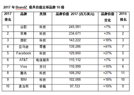 今年,全球百強品牌的品牌總價值增長了8%,達到3.64萬億美元(2016年該數值為3%),而且品牌價值超過1000億美元的品牌數量從6個增至9個。在該排名中,創新型技術品牌逐漸增多,這些品牌不但享有龐大消費者群體和優質品牌建設能力,而且均以消費者為中心。百強品牌的總價值與2006年首次發布該排名時相比增長了152%。今年BrandZ 排名前十的品牌總價值幾乎與2006年的100強總價值相等(1.42萬億美元比1.44萬億美元),增長率為249%,100強整體的品牌價值增長152%。