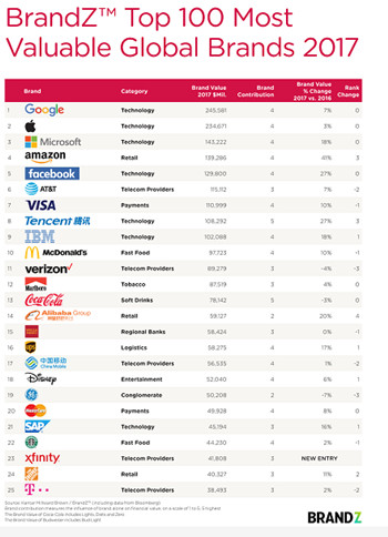 谷歌、蘋果和 微軟仍穩居排行榜前三位,品牌價值在過去一年間分別增長了7%(達到2456億美元)、3%(達到2347億美元)和18%(達到1432億美元)。而排名第五的Facebook則實現了27%的增長,品牌價值達到1298億美元。在BrandZ?最具價值全球品牌100強的品牌價值總和中,排名前五的品牌合計占到25%,這突出顯示了它們在現代商業環境中的主導地位。