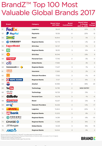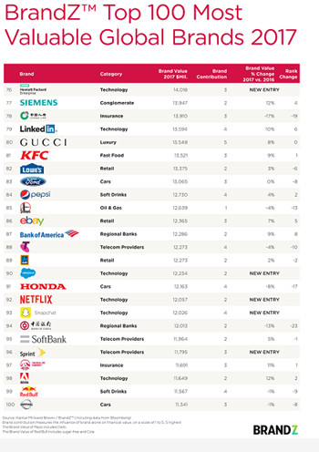 作為全球最大、最權威的品牌建設平臺,BrandZ研究對象是那些已經融入消費者日常生活之中的品牌。這項品牌估值研究采用了業內獨有的調查方法,將全球300多萬消費者的訪談結果與各家公司財務和經營業績分析(使用來自彭博社和凱度消費者指數的數據)相結合。