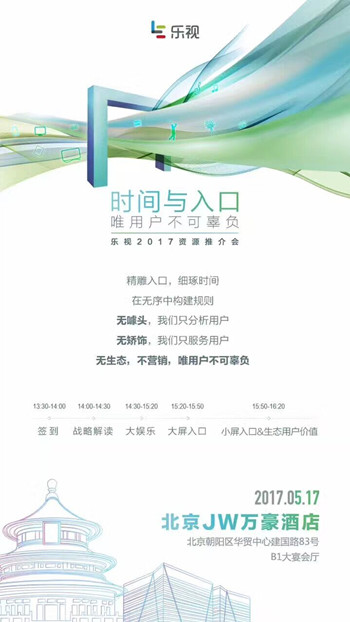 樂視5月17日拉開北上廣三地資源推介會的序幕。一句“入口+時間,唯用戶不可辜負”成為此次推介會的Slogan,刷屏同時引發(fā)猜想——這可能是樂視的重大戰(zhàn)略升級信號?與此同時,據(jù)說還會有重量級嘉賓神秘到場,更成為不可錯過的理由。